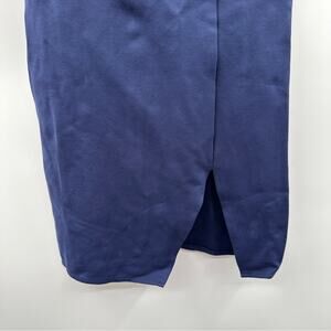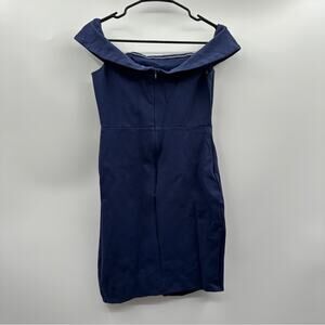 Medium-weight stretch knit shapes a folded, off-the-shoulder neckline with short sleeves, and a princess-seamed bodice. Fitted waist tops a sexy bodycon skirt with a side slit. Hidden back zipper/clasp. Solid navy blue color. Rayon / nylon /spandex self. Bodice 100% polyester lining.