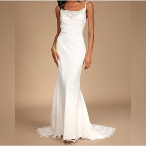 Lulu’s Dress Lyrics of Love White Lace Cowl Neck Mermaid Maxi Dress Size Large