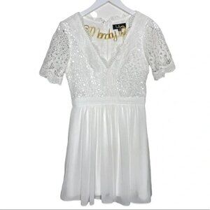 NWT Lulus White Angel In Disguise Lace Chiffon Skirt Skater Dress Size S