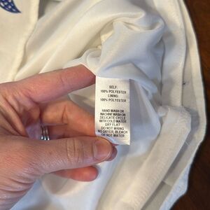 Excellent condition 100% polyester boho style white and blue embroidered mini dress with zipper down back. Womens side small. Measurements taken flat are approximately: