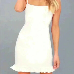 Medium-weight stretch knit shapes a straight-cut neckline and darted bodice, supported by adjustable skinny straps. Figure-flaunting, bodycon skirt ends at a daring mini length, finished with feminine ruffle trim. Hidden back zipper/clasp.