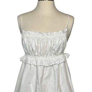 Pretty and feminine Lulus white cotton empire waist backless mini (or top). Gathering around empire waist and neckline. Gathering under the bust. Straps can be criss-crossed or run straight over the shoulders to tie at the back waist. Empire waist is elastic all around. Top/dress is lined from the waist down to the hem and is 100% cotton (both the dress and the lining). Excellent pre-owned condition. Size M.