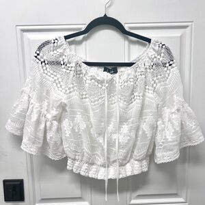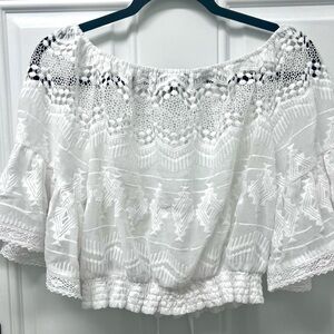 Elegant white lace blouse. Features intricate patterns. Off-shoulder design. Perfect for casual or dressy occasions. Sheer.