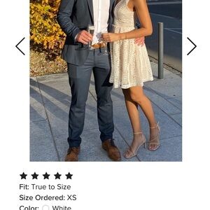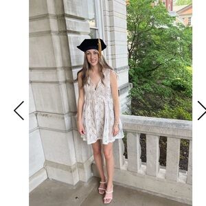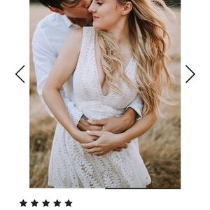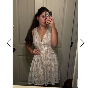 Elegant white lace dress. Sleeveless with a deep V-neckline. Perfect for special occasions.