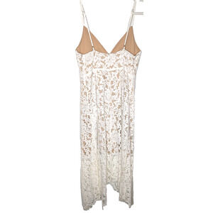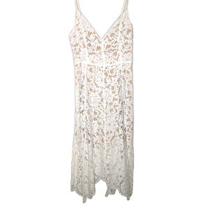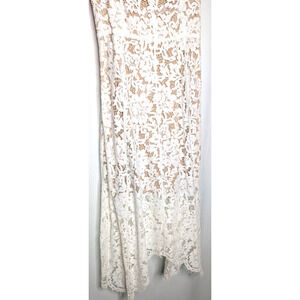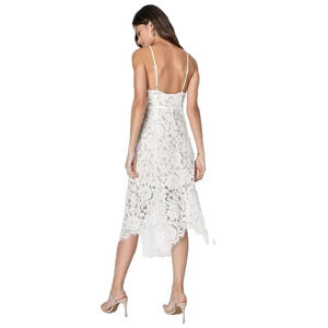 Elegant white lace midi dress. Features a flattering V-neckline. Perfect for special occasions.