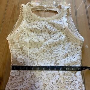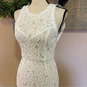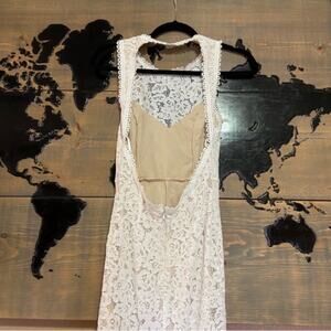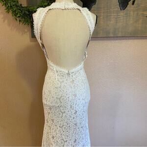 Chic white lace dress with open back, leg slit. Sleeveless design. Ideal for weddings.