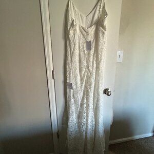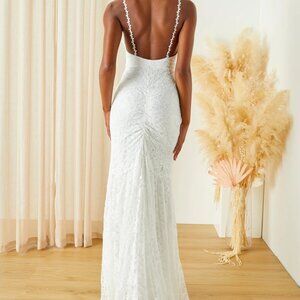 Ride off into the sunset looking absolutely heavenly in the Lulus Blissful Ever After White Lace Ruched Sleeveless Maxi Dress! Romantic floral lace (atop a white knit liner) shapes a V-neckline and a princess-seamed bodice with an alluring low back design, all supported by slender, floral crochet straps. High, fitted waist sits atop a figure-flaunting mermaid skirt that falls to a maxi hem with an elegant train at the back, accented with eyelash lace trim. Flattering ruching at the back lends a modern element to this stunning dress. Hidden side zipper/clasp.