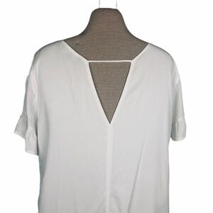 Chic white mini dress. Short sleeves with ruffle detail. Perfect for casual outings.