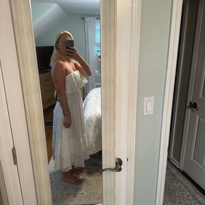 Elegant white midi dress. Features ruffle detailing. Perfect for any occasion.