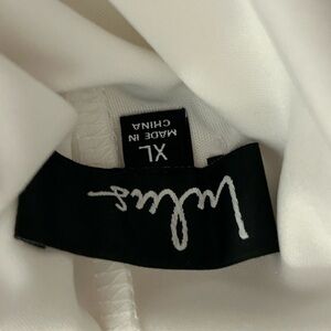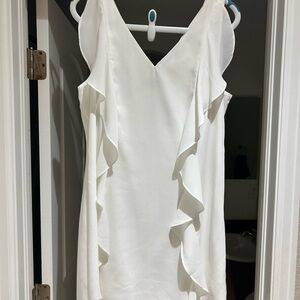 Elegant white mini dress. Features ruffle details. Perfect for any occasion.