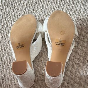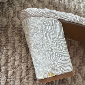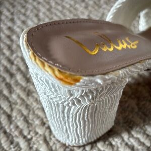 Experience the perfect blend of style and comfort with Lulu's white mules. These shoes feature a charming ruffle detail on a textured fabric upper. A couple small stains on the back of each shoe, pictured. Never worn!
