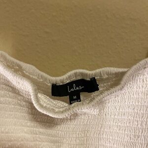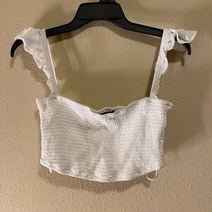 Chic white crop top with ruffled straps. Smocked texture for a trendy look.