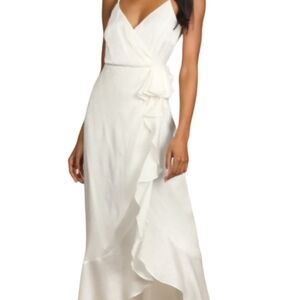 This stunning Lulu's white faux wrap dress is the PERFECT reception dress for a bride to dance the night away at her wedding! Comfortable, lightweight, and absolutely gorgeous. Brand new without tags in size small.
