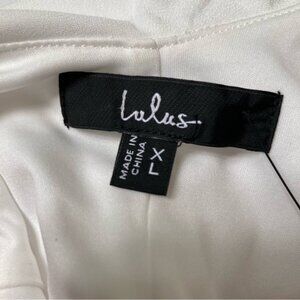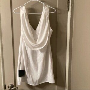 Lulu's white V-neck sleeveless mini dress in good used condition. No rips, tears, holes or stains. There is a draped piece of material that follows the curve of the back of the neckline and goes from shoulder to shoulder. 4" slit on the left-hand side to aide in ease of movement. From the top of the strap to the bottom of the dress is approximately 32 1/2". The bust is approximately 18" just for the front measurement.