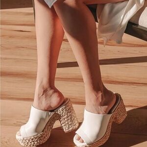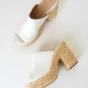 Elevate your look with these stylish mules. White upper with woven tan platform. Perfect for any occasion.