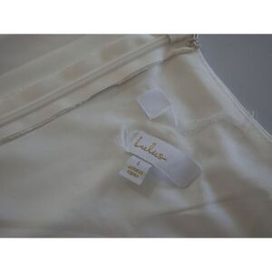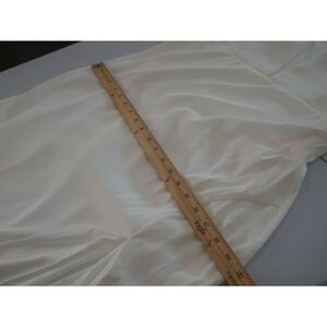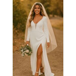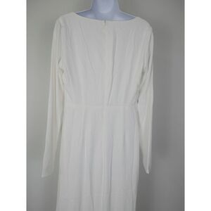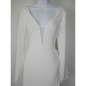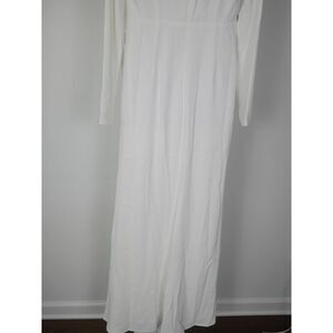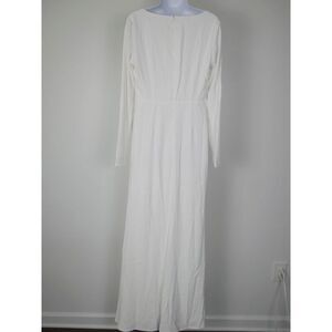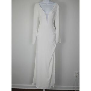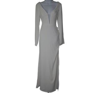 Keywords: white maxi dress size L, long sleeve formal gown, mesh insert v-neck dress, bridal shower outfit, lulus white dress slit, new without tags elegant dress