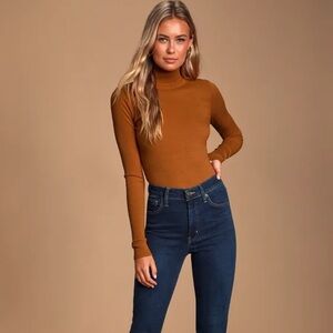 Lulu’s Wilde Rust Orange Ribbed Long Sleeve Mock Neck Bodysuit