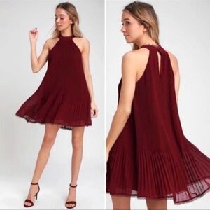Lulu’s Red Wine Pretty Pretty Pleats Swing Dress. This is begging to be worn for your next special occasion! Perfectly pleated woven chiffon falls from a high, halter neckline into a swaying swing silhouette with a flirty mini hem. Circular crochet lace trims the neck and hem for a finishing touch. Back keyhole with a button. Fully lined. Like new. Size small.