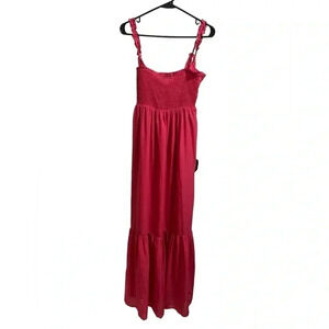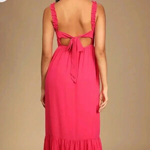 Beautiful and trendy maxi dress. Vibrant pink color. Ruffled elastic straps. Square neckline. Sleeveless smocked bodice. High empire waist. Flowy A-line skirt with maxi hem. Tie back detail. Lined.