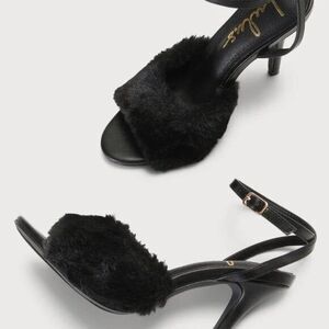 Lulu's Women Black Faux Fur Ankle Strap High Heel Sandals