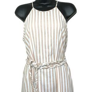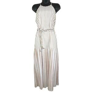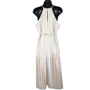 Lulus Women’s Beach Town Bound Striped Pleated Midi Dress Ivory/Tan Size Medium
