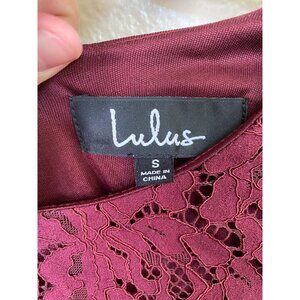 Lulus Womens Burgundy Floral Lace Mini Dress S 3/4 Sleeves Scalloped Hem Cotton