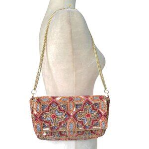Lulus Women's Floral Coral Gold Multi Color Clutch Shoulder Chain Bag Party Cocktail Purse