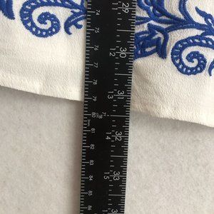 Women's Tale To Tell blue and ivory white short sleeve embroidered boho mini dress. Short sleeves, lined bodice, unlined sleeves. Crew neckline, swirling blue embroidery, woven fabric. Darted shift bodice, exposed gunmetal back zipper closure, mini length.