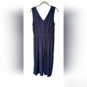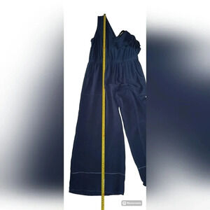 Lulu's Women's Sleeveless, Wide Leg, Gauzy Pull On Jumpsuit with two front pockets, L, the stretchy waist measures approximately 14", the length measures approximately 48" from the top of the sleeve, the chest measures approximately 17"