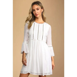Keywords: Lulus, babydoll dress, white dress, short dress, long sleeve dress, crochet lace, bell sleeves, women's fashion, casual dress, formal dress, party dress, cocktail dress, lightweight fabric, intricate lace, pre-owned dress