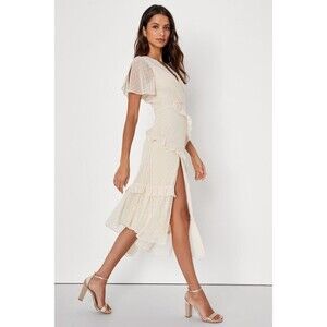 Lulus Womens Swiss Dot Ruffled Midi Dress S Cream Front Slit Beach Travel V-Neck