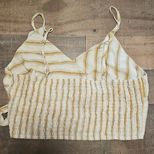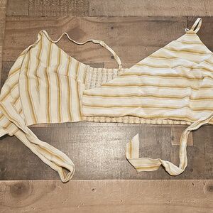 this Lulu's wrap style top is cream colored with burnout yellow almost orange and blue colors stripes. size large. preowned but in great condition with no notable flaws. laying flat this top measures about 14 and a half inches wide at the bottom and 15 inches apart at its widest part.