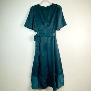 Description: "Slip into the Lulus "Wrapped Up In Love" Dark Green Satin Faux-Wrap Midi Dress and you'll instantly be in love! Luxe, woven fabric with a satiny finish forms this ultra-chic dress with a surplice bodice framed by fluttering short sleeves and a faux wrapping midi skirt with a ruffle-trimmed high-low hem. Fitted waist with removable sash tie. Hidden back zipper/clasp." - From Lulu's website