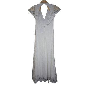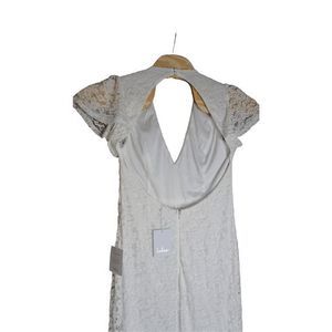 For sale is this Lulus XL Your Hand in Mine White Lace Flutter Sleeve Bridal Maxi Dress. This dress is in like new condition with tags still attached! Please see all pictures as their is a small hole on the bottom of the back of the dress and a small black mark. Have not tried to remove any stains pictured.
