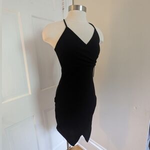 Little black dress with wrap bust and spaghetti straps, polyester, size xs