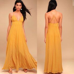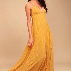 Lulus Exclusive! Lift your spirits in the Elevate Mustard Yellow Embroidered Maxi Dress! Gauzy woven poly with shiny embroidered stripes flows from crisscrossing, adjustable straps, into a princess-seamed triangle bodice. Set-in waist tops a full maxi skirt. Elastic at back for fit, and hidden back zipper/clasp.