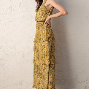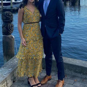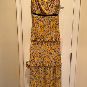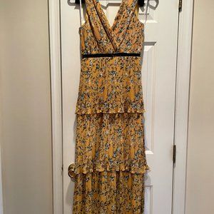 Beautiful Yellow tiered Maxi Dress from Lulu's. Perfect for guest of a black tie optional or cocktail attire wedding or vacation. Floral print is blue and white on yellow background, darling black bow ties at shoulders, v-neck front and back, tiered ruffle/pleated details. Midi or maxi length depending on your height. I am 5'4". Worn only once. In excellent condition!