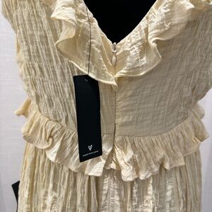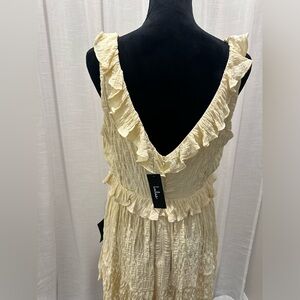 Elegant yellow mini dress with ruffle details. Crinkle texture adds charm. Ideal for casual outings or dressed up for an event!