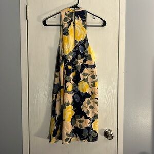 Sleeveless halter mini sundress from Lulu's with yellow and white floral design. Plunging neckline and a flowing lightweight silhouette. EUC