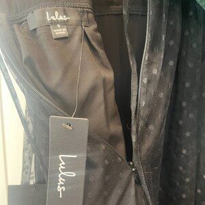 You'll be a vision to remember in the Lulus Yours Evermore Black Swiss Dot Ruffled Midi Dress! This dress features a gauzy sheer mesh overlay adorned with Swiss dots throughout (atop a black knit lining) that shapes a plunging V-neckline (and back) with sheer ruffled short sleeves. A lightly pleated bodice tops a tiered waist (with tying details at the front and back) that ends at a twirl-worthy midi skirt. Hidden back zipper/clasp.
