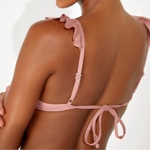 Lulus Across the Tides Mauve Ruffled Bikini top. This cute bikini top is composed of sleek stretch knit fabric that shapes a V-neckline with padded, triangle cups and adjustable spaghetti straps (with ruffled accents) that tie at the back. I wore it only once. Perfect condition.
