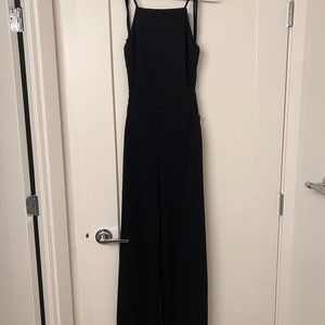 Never worn, with tags! Sleek stretch knit forms a fitted bodice with darting and a high apron neckline. Spaghetti straps frame a sexy open back, while pant legs fall below the fitted waistband with diagonal front pockets. Hidden back zipper.