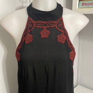 Lightweight woven rayon falls from a tying, halter neckline into a backless bodice trimmed in rust red embroidery. Sheath skirt falls to a scalloped hem with more embroidery. Hidden back zipper/clasp. In good condition. Detail on zipper back check photo is not a hole Pre owned smoke free home