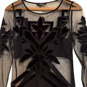 Lulus black long sleeve dress with mesh top and sleeves. Bra top. Small. EUC. Polyester with polyester and spandex lining. Dry clean.