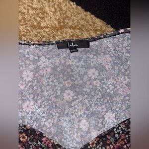 sheer top with floral pattern. Features pink and gray hues. Lightweight and stylish.