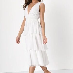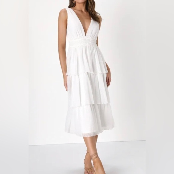 Stunning Lulus dreamy mood white Swiss dot tiered midi dress. Polyester. Pull on. Stretch waist. Easy to fit and wear. Lined. Washable.Size Small.