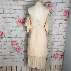 Be at the top of your style game in the Keepsake All Time High Nude Lace Off-the-Shoulder Dress! Lightweight woven poly falls from slender straps into a floral lace neckline with short, accordion pleated off-the-shoulder sleeves, and princess seamed bodice. Accordion pleating continues into a tiered midi skirt. Tying back cutout and hidden zipper. As Seen On Keri of @kerifay!