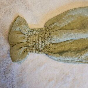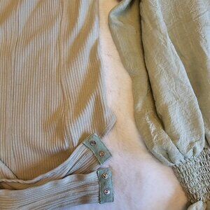 Gently used lulus light/muted green bodysuit, the bodysuit is more of a ribbed material and the sleeves are puffy. Size small