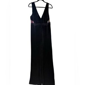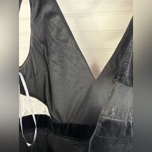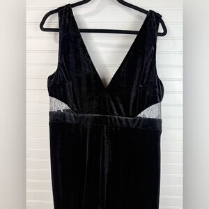 Lulu’s luxurious ease black velvet & lace fancy straight leg jumpsuit. Size XL. NWOT. This features a deep V in front and back, back zipper, lace cutouts on sides and back. Stretchy!