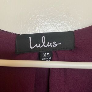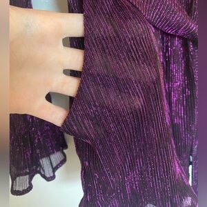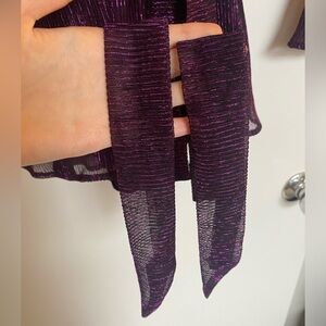 Sparkly, metallic purple long sleeved striped romper, with pockets. Sleeves are sheer, waist tie, ~3” inseam. So pretty, worn once to a party!